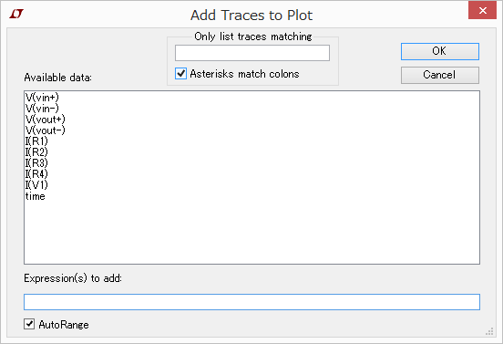 LTspiceのプロットのメニューで、Plot Settings→Add traceを選択します。